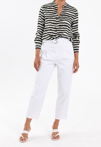 Blouse à rayures noires et blanches avec col, dotée d'une patte de boutonnage à l'avant et de fines lignes d'accent jaunes, associée à une ceinture blanche.