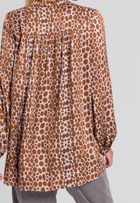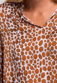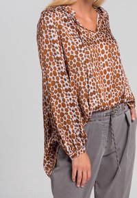 Femme portant un chemisier ample à manches longues à pois marron et un pantalon gris à cordon, debout avec une main dans la poche.