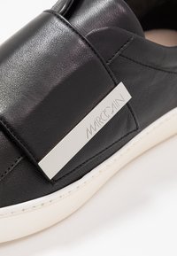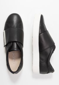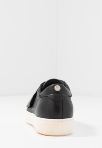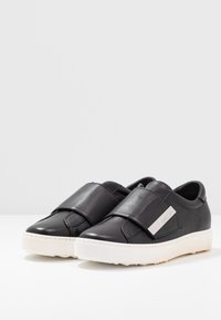 Baskets en cuir noir avec une tige texturée, une large bande Velcro et une semelle en caoutchouc blanche. Design élégant et moderne avec des accents minimalistes.