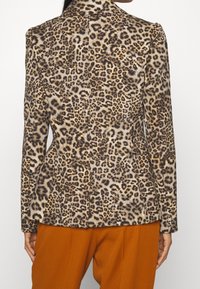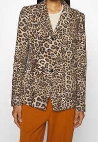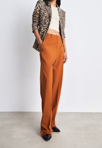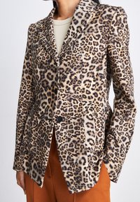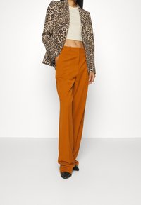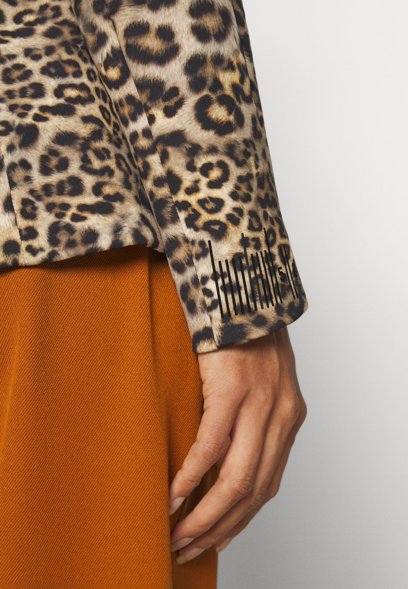 Haut à manches longues imprimé léopard avec poignet sur tissu texturé orange brûlé, montrant une main détendue sur le côté.