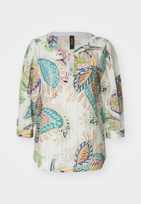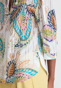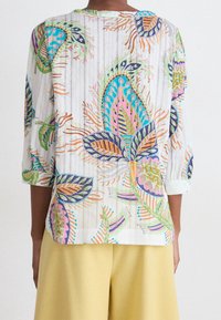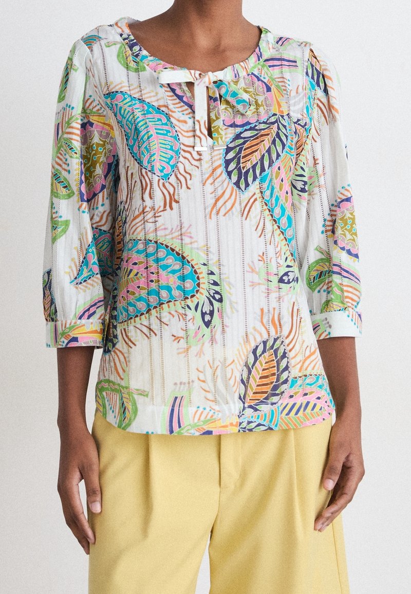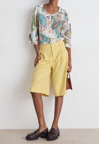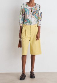 Femme portant un chemisier blanc avec des imprimés botaniques colorés et un col lavallière, associé à un pantalon jaune clair.