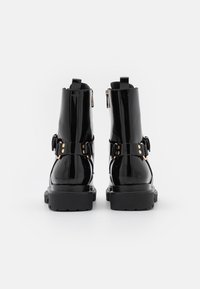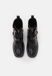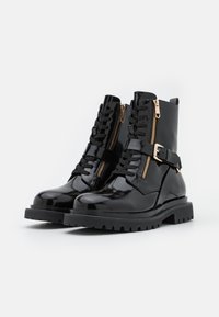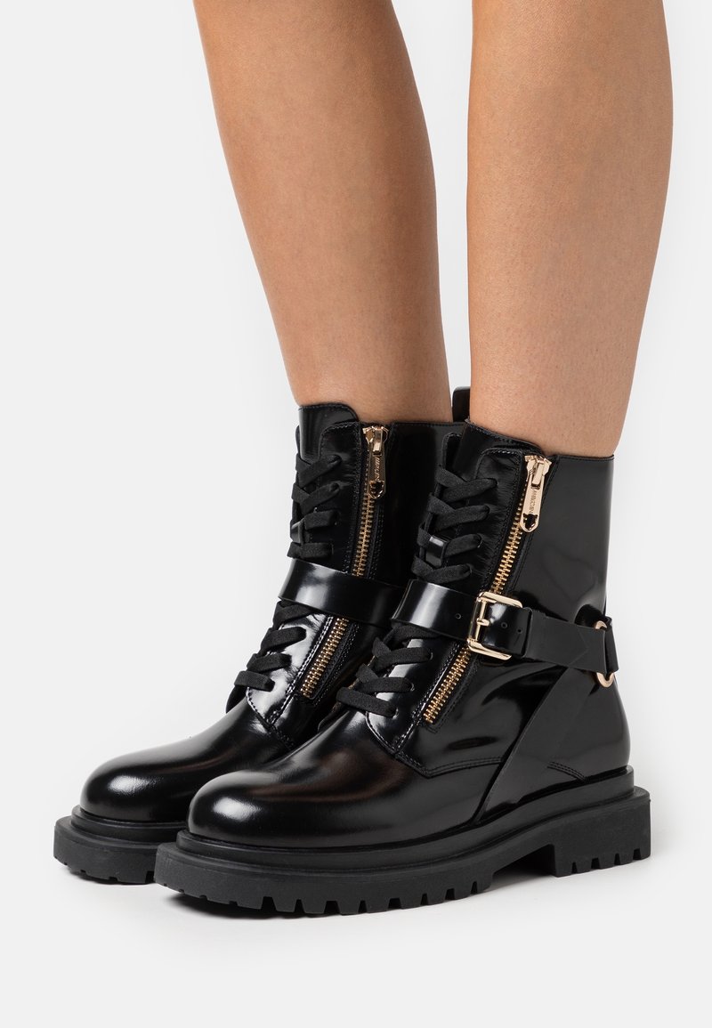 Bottines en cuir verni noir avec deux fermetures éclairs, devant lacé, accent de boucle, semelle épaisse et éléments métalliques dorés contrastants.