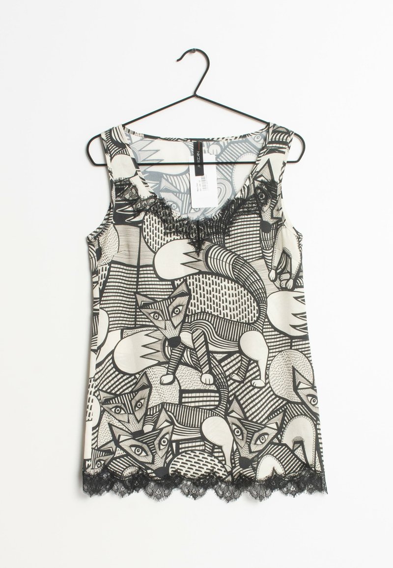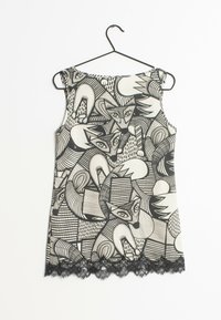 Haut sans manches avec un motif renard noir et blanc, un col arrondi, une bordure en dentelle à l'ourlet, et un tissu lisse et léger.