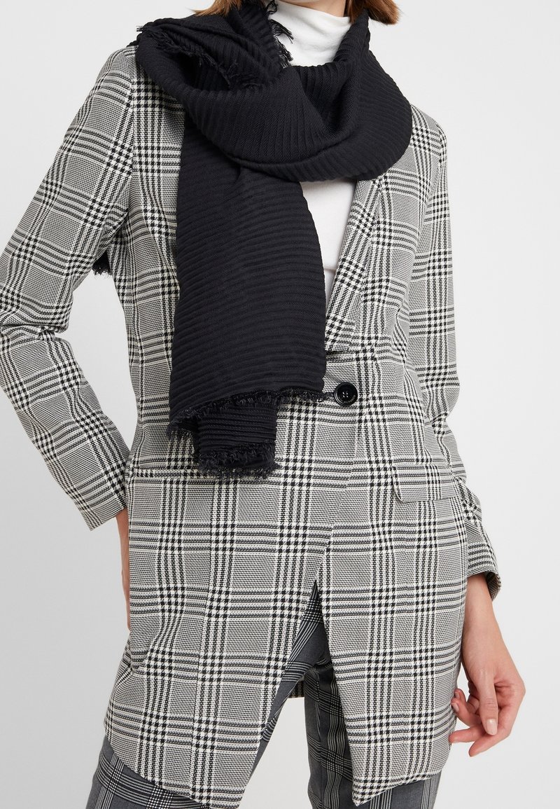 Femme portant une écharpe noire côtelée sur un col roulé blanc et un long blazer à carreaux noir et blanc assorti à un pantalon à carreaux.
