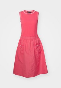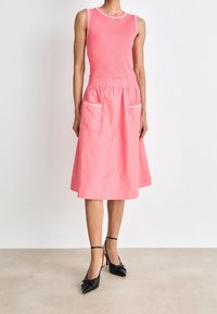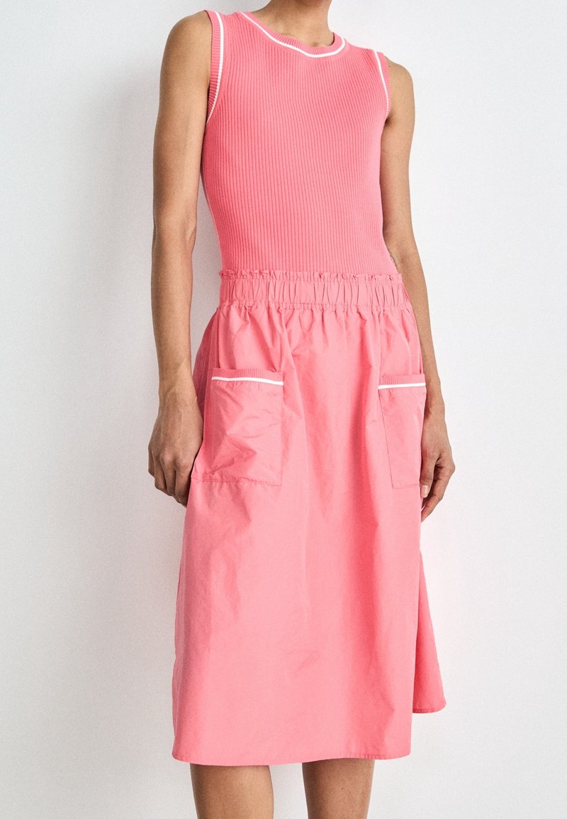 Femme portant un haut rose sans manches côtelé et une jupe rose assortie avec une taille élastique et des poches avant, debout contre un mur blanc.