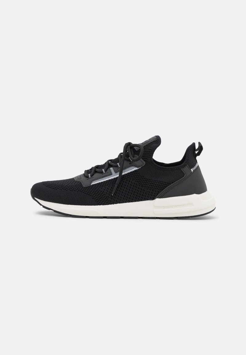 Baskets montantes basses en tricot noir avec semelle blanche, lacets noirs et languette à l'arrière, vues de côté sur un fond blanc.