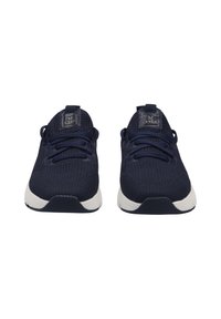 Baskets en mesh bleu marine avec une semelle blanche, une tige texturée et un design à lacets. Comprend une languette pour faciliter l'enfilage et l'adhérence.