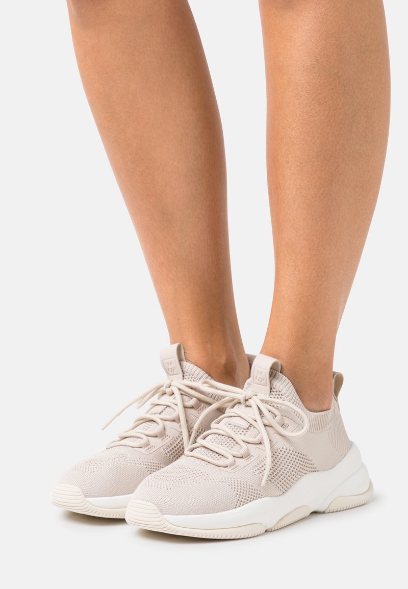 Baskets en tissu tricot beige avec un design à lacets et des semelles blanches épaisses portées pieds nus sur un fond uni.