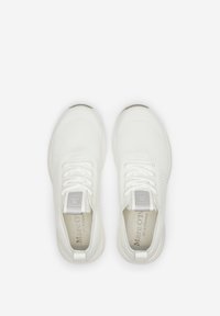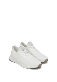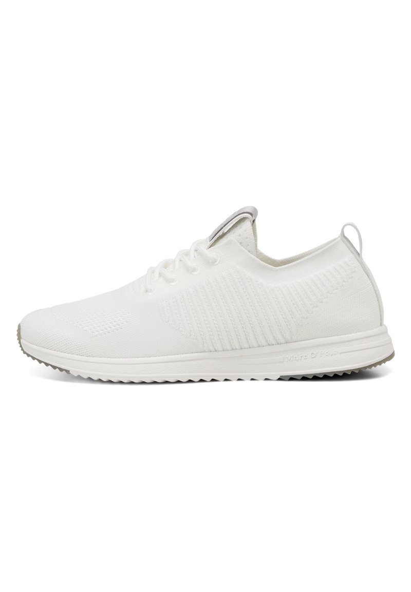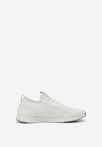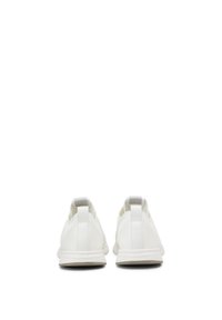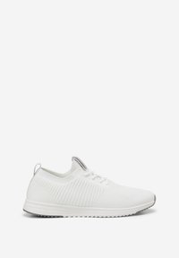 Chaussure de sport blanche avec une tige en maille respirante, un design à lacets, des bandes texturées et une semelle en caoutchouc pour l'adhérence.