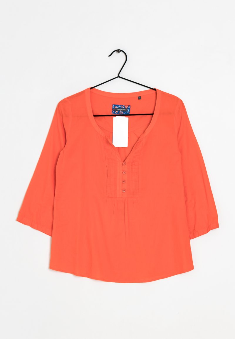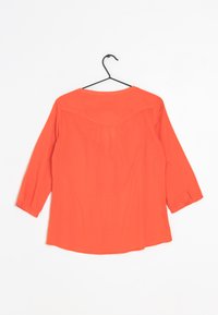Blouse à manches longues orange vif avec un col en V, quatre boutons et une coupe ample, suspendue à un cintre noir sur un fond blanc.