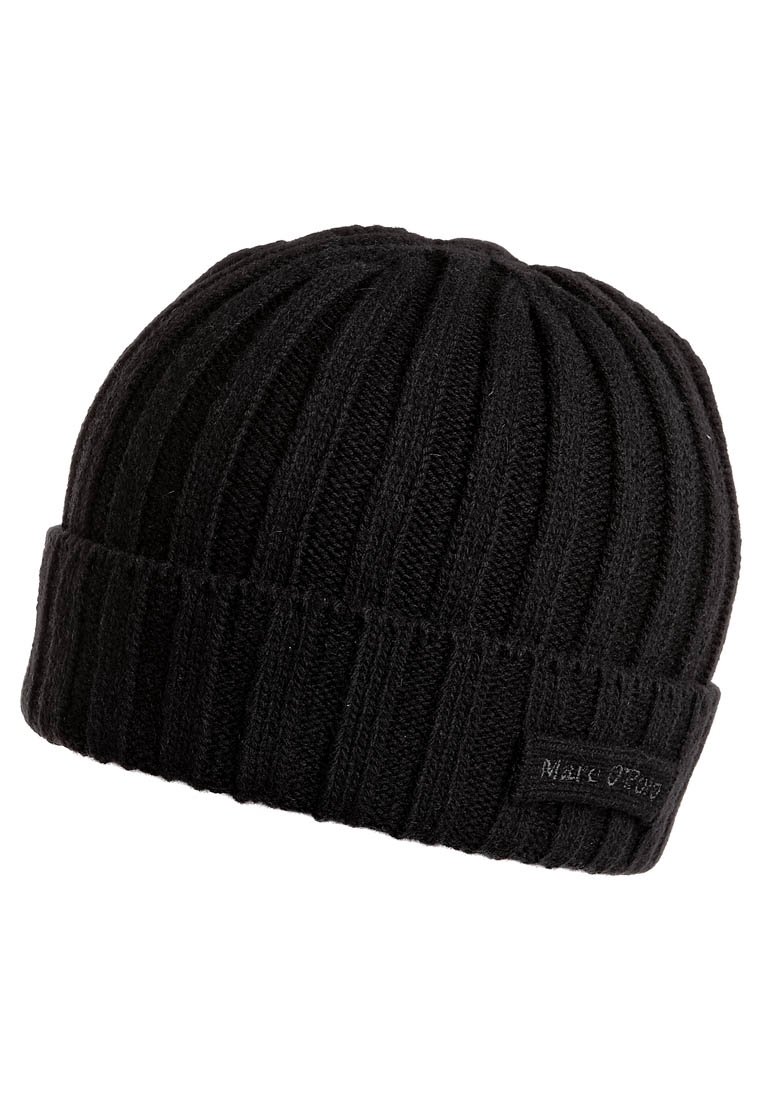 Bonnet noir en tricot côtelé avec revers plié et petit patch logo cousu.