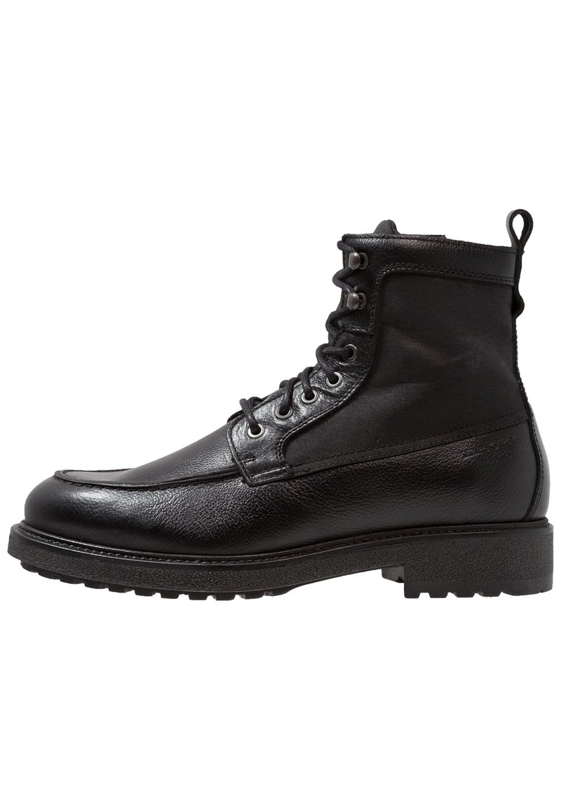 Bottines en cuir noir avec une finition texturée, bout rond, design à lacets et semelle en caoutchouc robuste. Comprend des oeillets renforcés et une languette.