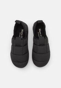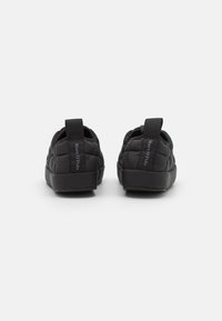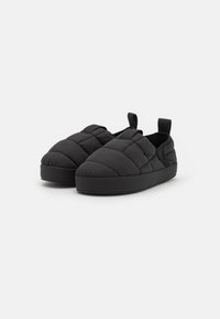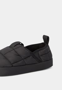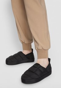 Pieds portant des chaussures noires matelassées à enfiler, associées à un pantalon beige retroussé, sur un fond clair uni.