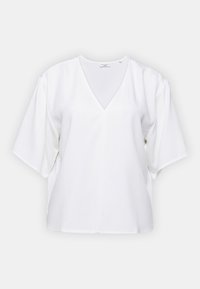 Blouse blanche à manches courtes avec un décolleté en V, fabriquée en tissu lisse. Elle présente une coupe ample et des fentes sur les côtés pour un confort et un style supplémentaires.