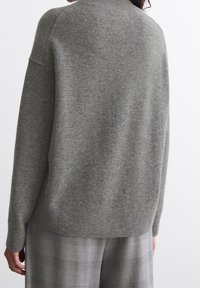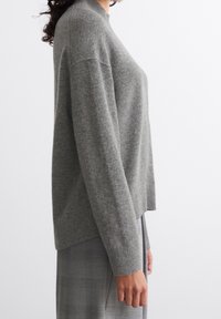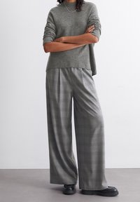 Personne portant un pull gris côtelé à manches retroussées et un collier chaîne argenté, assorti à un pantalon plissé à carreaux gris.