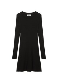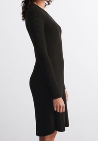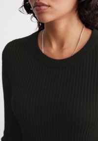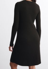 Femme portant une robe noire en maille côtelée à manches longues et un collier chaîne argenté, les mains reposant sur le bas du dos.