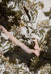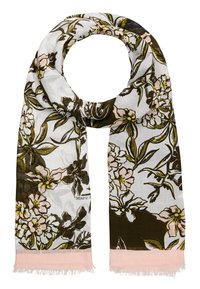 Femme portant un manteau couleur chameau avec des poches à rabat et une écharpe à motifs floraux rose et olive nouée autour du cou.