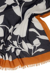 Écharpe légère avec des motifs floraux abstraits bleu marine et blancs, bordée d'orange brûlé avec des extrémités à franges.