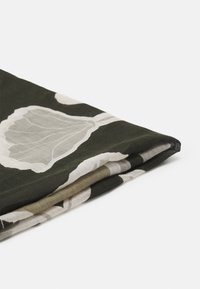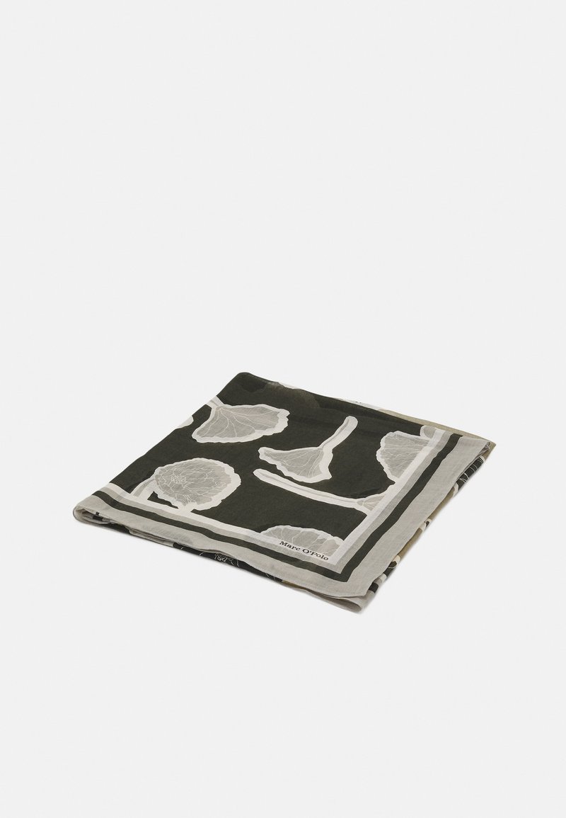 Écharpe vert foncé pliée avec des motifs abstraits de feuilles gris clair et une bordure gris clair, posée à plat sur un fond blanc.