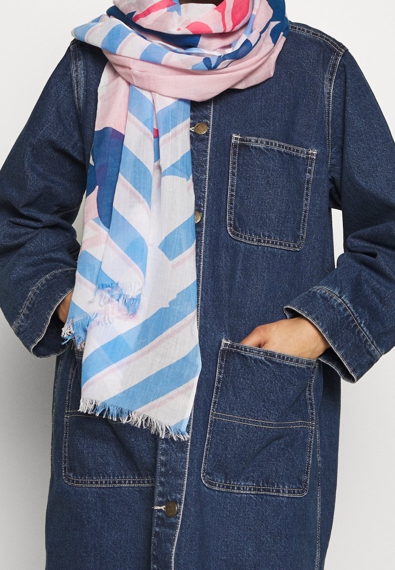 Personne portant une veste en denim bleu avec des poches avant et une écharpe rayée pastel rose, bleue et blanche drapée autour du cou.