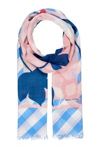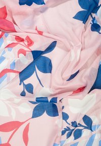 Personne avec les mains dans les poches d'une veste en denim foncé, portant une écharpe blanche, rose et bleue à motifs, nouée de façon lâche autour du cou.