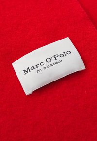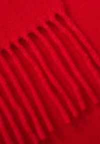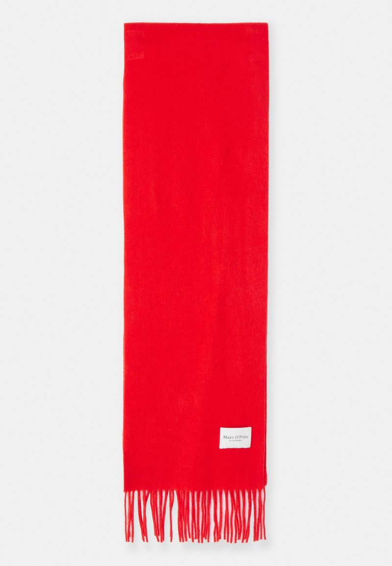 Écharpe rectangulaire rouge vif avec des extrémités à franges et une étiquette blanche rectangulaire près du bord inférieur sur un fond neutre.