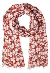 Femme portant un chemisier bordeaux à boutons, un pantalon blanc et une écharpe blanche avec des motifs floraux rouges et des bords frangés.