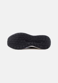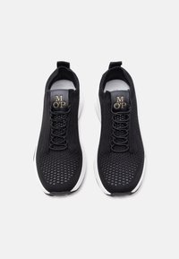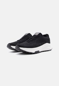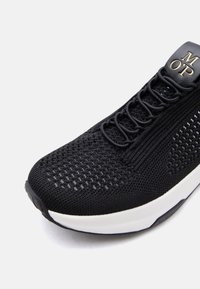 Chaussure de sport tricotée noire avec semelle épaisse blanche, design bas, et enfiler avec lacets élastiques, présentée de profil sur fond blanc.