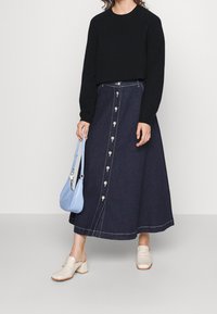 Pull en maille noire avec un col rond, des épaules tombantes et des poignets côtelés. Associé à une jupe en jean boutonnée.
