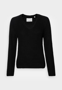 Femme portant un pull noir en maille à col en V et un jean bleu clair, debout les mains détendues le long du corps devant un fond uni.