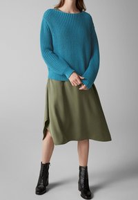 Personne portant un pull en maille épaisse bleu turquoise par-dessus une robe vert olive, ajustant la manche avec les mains.