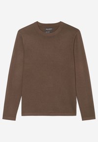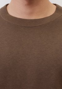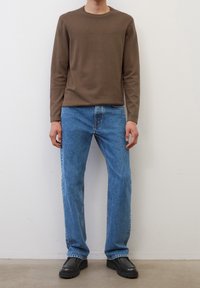 Homme portant un pull marron uni à manches longues et un jean bleu, debout devant un fond blanc, les mains détendues le long du corps.