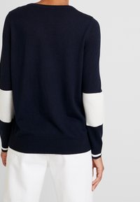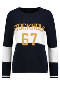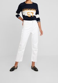 Femme portant un pull à manches longues bleu marine et blanc avec l'inscription "STOCKHOLM 67" en lettres dorées, associé à un jean blanc taille haute.