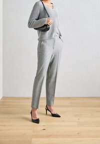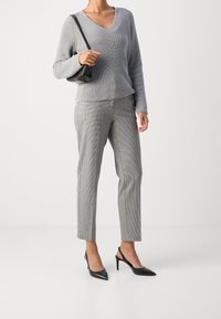 Femme portant un pull en maille côtelée gris clair à col en V, une main dans la poche d'un pantalon à carreaux gris, sur un fond uni.