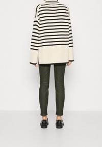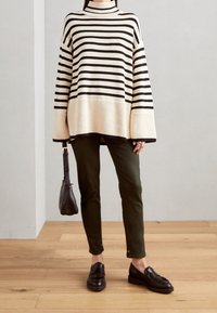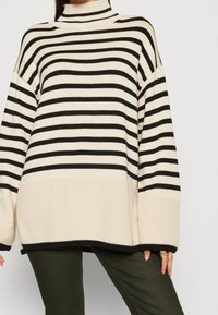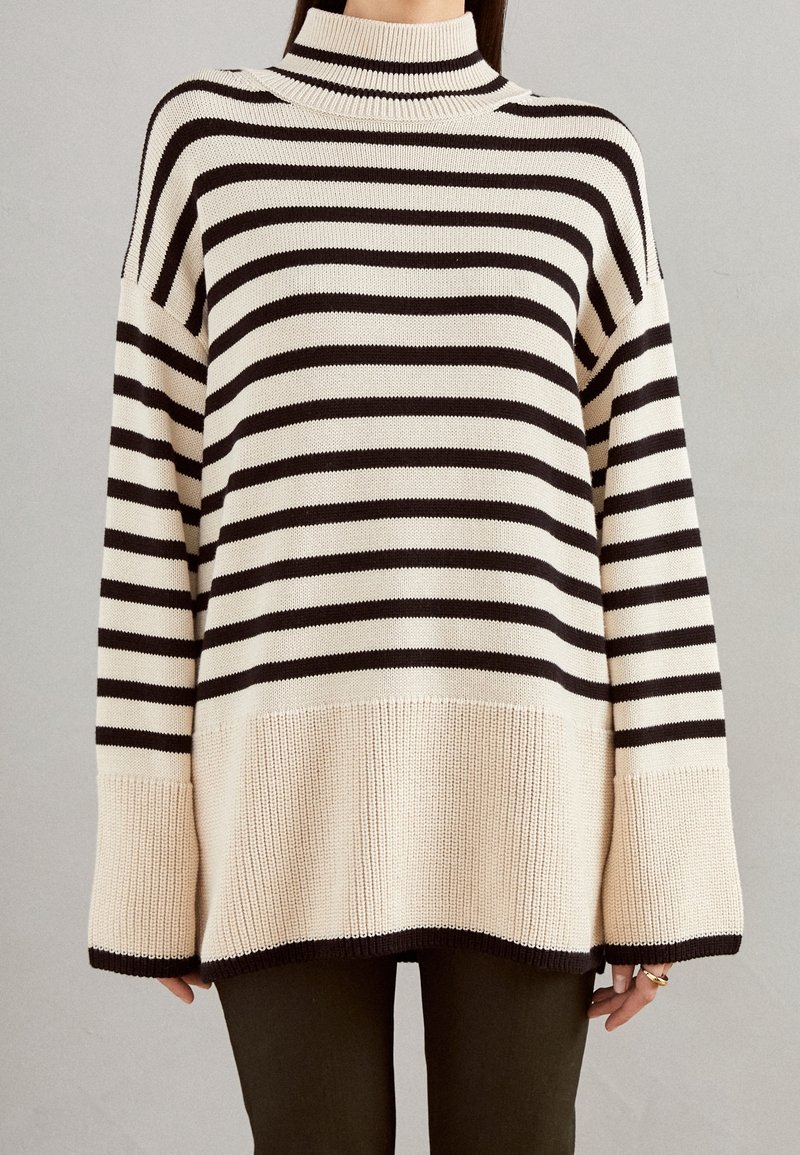 Pull à col roulé à rayures crème et noir, doté d'une coupe décontractée, de manches larges et d'une texture en maille côtelée. Ourlet accentué par des détails.