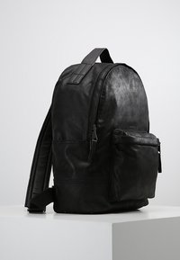 Sac à dos en cuir noir avec poche avant zippée et poignée supérieure, posé sur une surface blanche contre un fond clair uni.