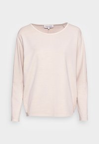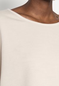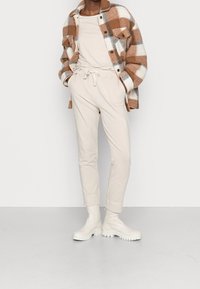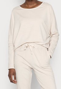 Personne portant un haut beige à manches longues et un pantalon à cordon, debout avec une main dans la poche sur un fond uni.