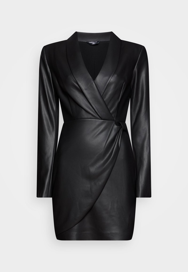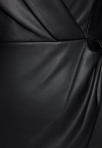 Robe enveloppante en cuir noir avec des manches longues, décolleté en V et un détail noué à la taille. Texture lisse et silhouette ajustée.