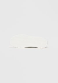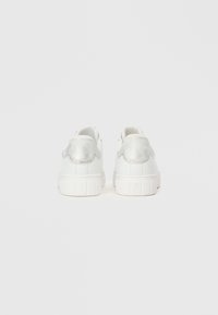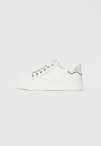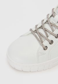 Baskets blanches avec une tige en cuir lisse, des accents argentés, une semelle texturée et des lacets métalliques. Présente un design de semelle légèrement surélevé.