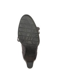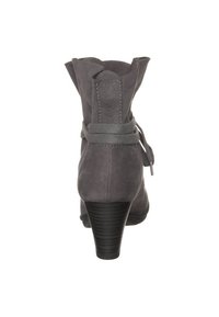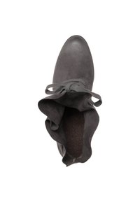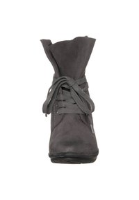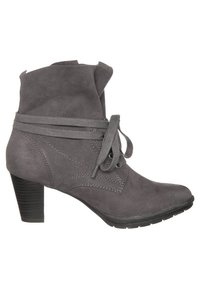 Bottine en suède gris avec un haut replié, un devant à lacets avec des coutures décoratives et un talon épais. Semelle en caoutchouc noir pour une bonne traction.