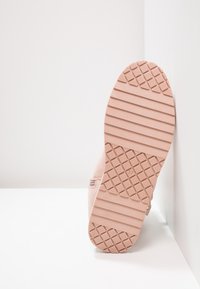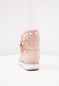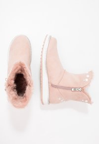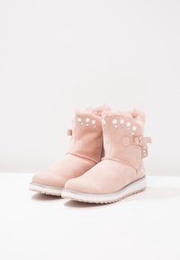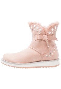 Bottines en daim rose avec bordure en fausse fourrure, strass décoratifs, fermeture éclair latérale et semelle en caoutchouc blanche. Dotées d'un détail en nœud à l'arrière.