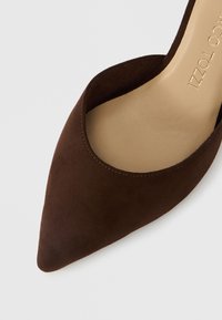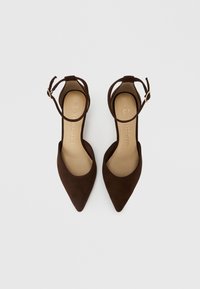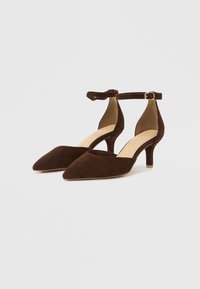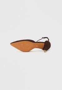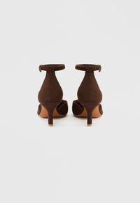 Escarpin à talon bas en daim marron avec un bout pointu et une bride de cheville munie d'une boucle ronde. Texture lisse et design minimaliste.