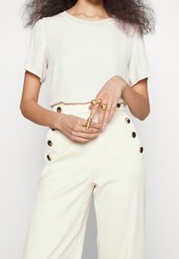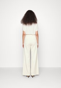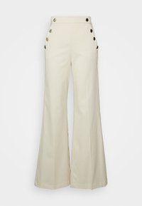 Pantalons larges crème à taille haute, avec de grands boutons métalliques sur les côtés, associés à des escarpins noirs à bout pointu.