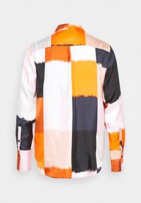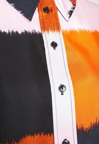 Chemise boutonnée multicolore avec des rayures orange, noire, blanche et rose. Confectionnée en tissu lisse, à manches longues et avec un col classique.