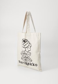 Sac fourre-tout en toile beige avec une fleur dessinée en lignes noires et le texte "marimekko" au centre en bas.