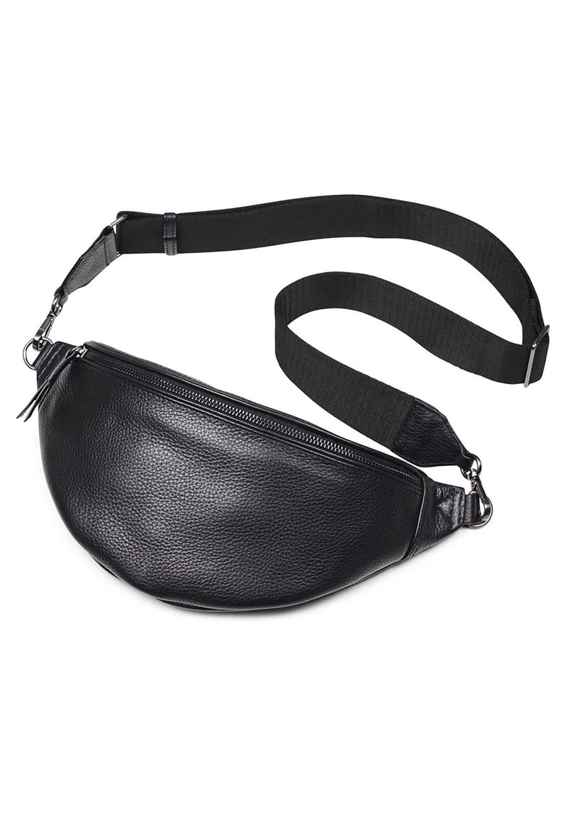 Sac banane en cuir noir avec sangle en tissu noir réglable et fermeture éclair, posé à plat sur un fond blanc.