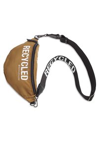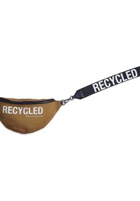 Sac banane marron avec sangle noire réglable, texte blanc "RECYCLED" sur le devant et fermeture éclair.