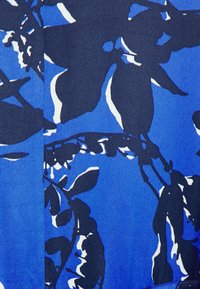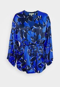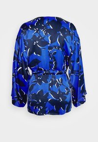 Robe kimono en satin bleu à motif floral, avec un design portefeuille, nouée à la taille, et des manches larges. Texture lisse avec une finition brillante.