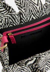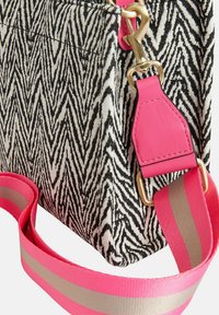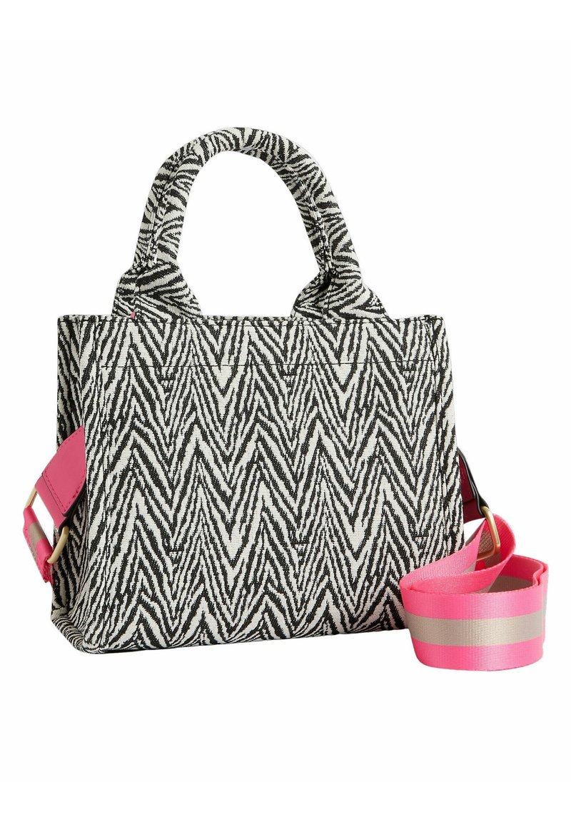 Sac à main en tissu à motif zébré avec un design chevron noir et blanc, équipé de deux poignées courtes et d'une bandoulière réglable rose.