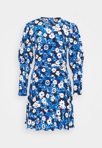Robe à manches longues en bleu, noir et blanc avec un motif floral. Elle présente un corsage ajusté et une jupe évasée avec un ourlet à volants. Texture de tissu lisse.